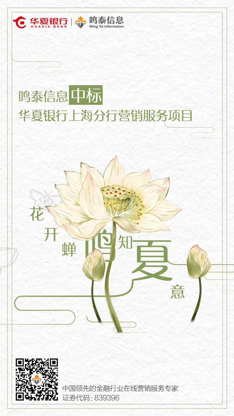 近日,我司正式收到华夏银行上海分行的中标通知书,华夏银行上海分行的项目尘埃落定,项目现已正式启动。鸣泰信息作为华夏银行上海分行的战略合作伙伴,提供全年度互联网营销策划的全案服务,包括营销工具开发、营销策划、内容运营等。