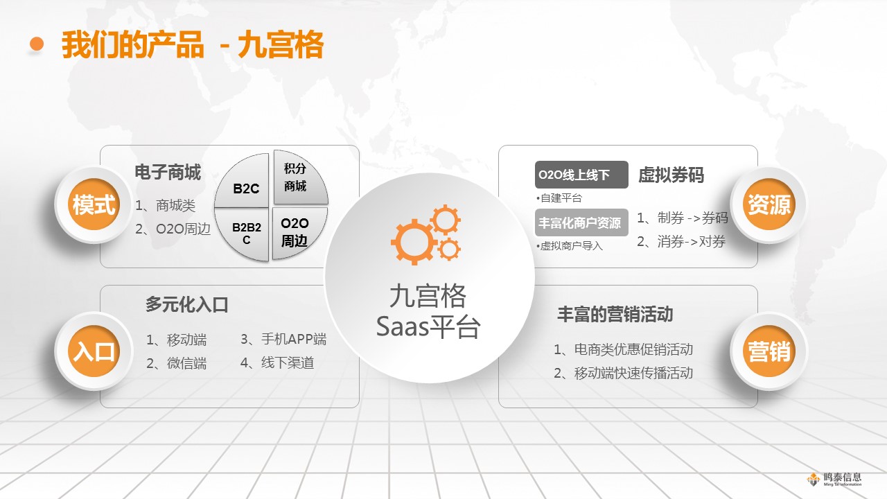 “九宫格”移动营销SaaS聚合平台打通银行等金融机构,从移动产品规划到营销商户资源的系统化完整链条,帮助客户整合优势资源,提供丰富的移动消费服务接入,为银行及金融机构构建全人群用户的综合移动场景营销服务。